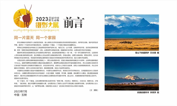7月24日,由中国摄影家协会、中国野生动物保护协会、青海省文学艺术界联合会、玉树藏族自治州人民政府共同主办,中国摄影报社、中共玉树藏族自治州委宣传部等承办的 2023首届中国野生动物摄影大展在青海玉树开幕,通过摄影全面展示玉树生态文明建设丰硕成果和独特丰富的野生动物资源,助力玉树打造“野生动物王国”世界级生态摄影旅游品牌。