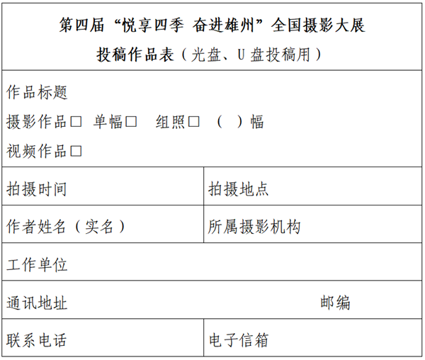 投稿作品以光盘(CD-R或DVD-R)、U盘存储形式邮寄至:北京市东城区东四十二条48号中国摄影报社活动项目部第四届雄县摄影大展办公室收(100007)