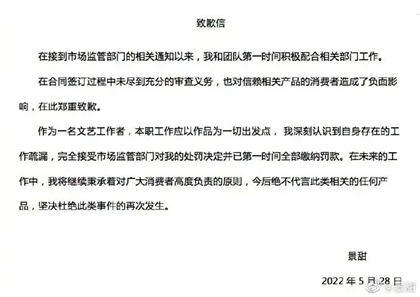 5月28日,演员景甜在其个人微博就“违法广告代言”发布致歉信,称接受市场监管部门的处罚决定,并已缴纳全部罚款。对消费者造成负面影响,表示郑重道歉,深刻认识自身存在的工作疏漏,今后绝不代言此类相关任何产品。