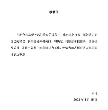 3月15日,演员邓伦偷逃税被追缴并罚款1.06亿元,随后发布致歉信称:“在配合这次税务部门检查的过程中﹐我已深刻自省,深刻认识到自己的错误,我接受税务机关的一切决定,我愿意承担相关一切责任及后果,并且一如既往地积极努力工作,疫情当前占用公共资源深深地表达歉意。”