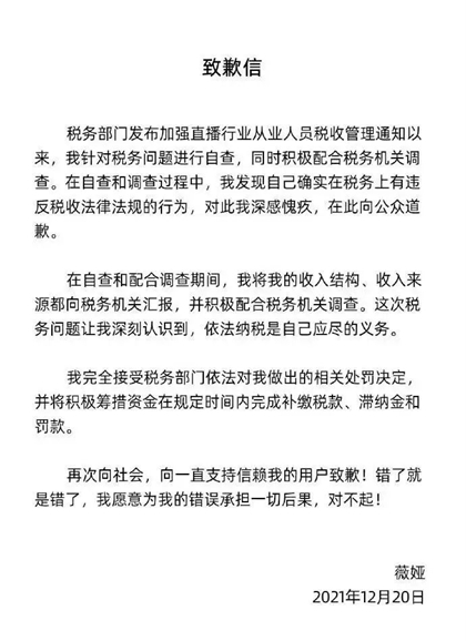 2021年12月20日,网络主播黄薇(网名:薇娅)因为偷逃税被罚13.41亿元,随后,发布道歉信称:“完全接受税务部门依法作出的相关处罚决定,将积极筹措资金在规定时间内完成补缴税款、滞纳金和罚款,愿意为错误承担一切后果。”