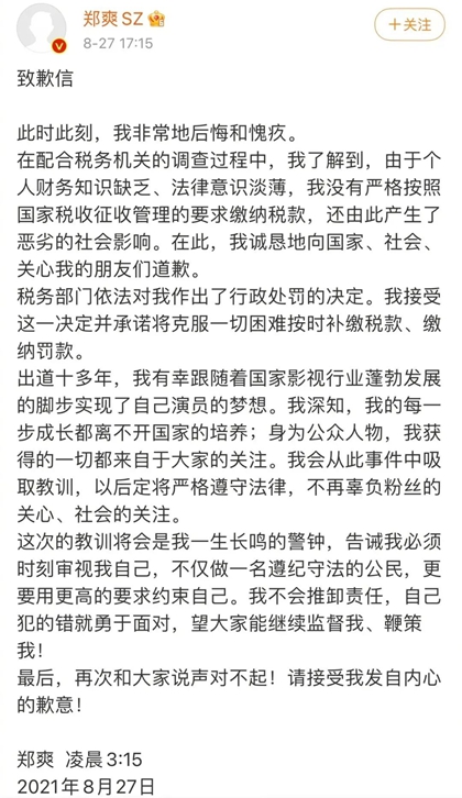 2021年8月27日,演员郑爽在微博发布致歉信。信中称,由于个人财务知识缺乏、法律意识淡薄,没有严格按照国家税收征收管理的要求缴纳税款,还由此产生了恶劣的社会影响。“在此,我诚恳地向国家、社会、关心我的朋友们道歉。”