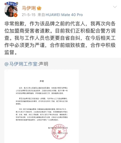 2021年5月15日,演员马伊琍代言的某品牌奶茶涉嫌违法犯罪,工作室为此发布声明称,知道情况后,“第一时间向该品牌提出解约通知,并积极配合经侦工作,提供线索及信息。”