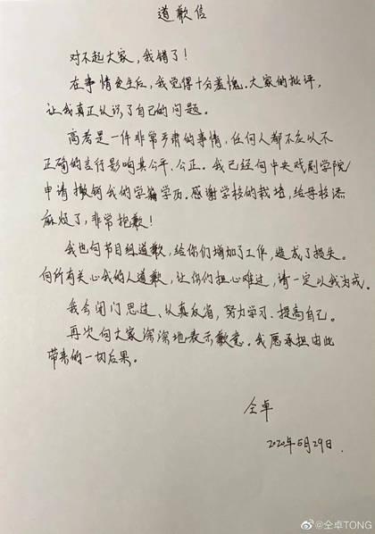 2020年5月29日,艺人仝卓在引发“学历造假”争议后,通过微博发布手写信道歉,信中称自己已向母校中戏申请撤销学籍学历,并愿意承担由此带来的一切后果。