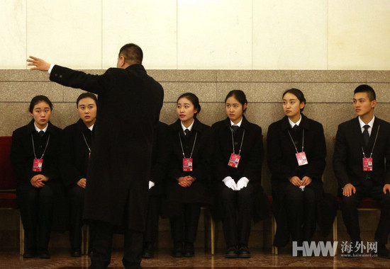 2016年3月2日,中国北京,2016年全国两会即将在北京举行。2016年全国政协十二届四次会议新闻发布会下午三点在人民大会堂一楼新闻发布厅召开。 北京人民大会堂,内场黑衣人正在听从指挥。