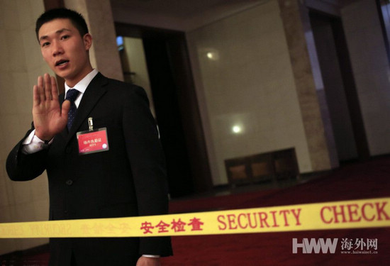 2016年3月2日,中国北京,2016年全国两会即将在北京举行。2016年全国政协十二届四次会议新闻发布会下午三点在人民大会堂一楼新闻发布厅召开。 北京人民大会堂,内场内衣安保人员在警戒线后值守,对着镜头摆手。
