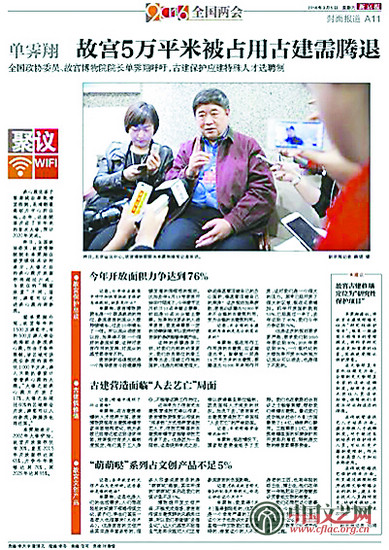 连日来,各大媒体全力关注全国两会。图为《新京报》刊载的本报记者采访单霁翔委员的图片新闻。
