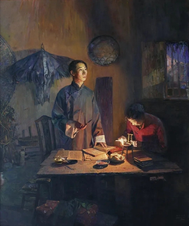 在画面艺术表现上,采用了现实主义加浪漫主义的表现方式。画面中母亲的原型其实是陈望道故居的管理员。这位管理员进入我的画面很偶然,当时屋子里烛光很暗,我请她拨亮烛火。就在此时,我忽然发现画面增添了新的意境——母亲的动作饱含对儿子的关爱,同时也喻意着薪火相传。最终在中央编译局、中国美协、中央美术学院有关领导建议下,确定了陈望道仰望窗外喻意东方欲晓,母亲拨动火苗引喻点亮信仰之火这一构思。