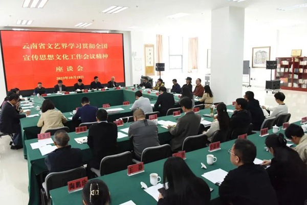 10月19日,云南省文联组织召开全省文艺界学习习近平文化思想贯彻全国宣传思想文化工作会议精神座谈会。会议指出,云南文艺界要在习近平文化思想指引下,更好地坚定文化自信,秉持开放包容,坚持守正创新,凝聚起推进强国建设、民族复兴的磅礴力量。全省文艺和文联工作要准确定位在强国建设、民族复兴新征程上的角色担当,深入学习贯彻习近平文化思想,勇担使命、踔厉奋发。引导团结全省广大文艺工作者深刻感悟习近平文化思想的真理光辉、理论内涵和实践伟力,真正用来认识和解决创作中遇到的问题,推动各门类艺术创作繁荣发展、人才队伍不断壮大,以高质量的文艺作品和文化服务,为谱写中国式现代化云南新实践持续添砖加瓦。