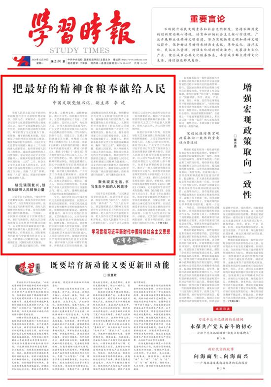12月30日,《学习时报》1版刊发了中国文联党组书记、副主席李屹的文章《把最好的精神食粮奉献给人民》。