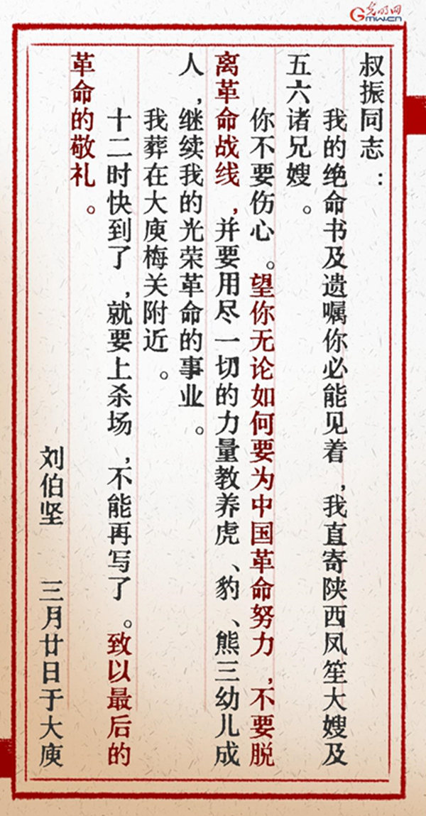 你不要伤心。望你无论如何要为中国革命努力,不要脱离革命战线,并要用尽一切的力量教养虎、豹、熊三幼儿成人,继续我的光荣革命的事业。