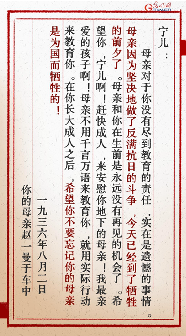在你长大成人之后,希望你不要忘记你的母亲是为国而牺牲的!