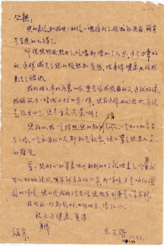 “爹!您耐心的(地)等着吧!胜利的日子就快来了,今年就可以打败德国,明年就要反攻日本,那时候才是咱们团圆的时候!您不信,我姐姐会告诉您现在形势是多么有利。”这封家书写于抗战后期,透露出徐光耀对抗战形势的清醒认识、对抗战胜利的憧憬和革命乐观主义精神。“这封信,纸已发黄,字迹稚拙,内容简略,可能还有错别字,但它既饱含了我作为人子的孝道亲情,更有我作为一位战士保家卫国的决心。”徐光耀曾这样定位自己的这封家书。