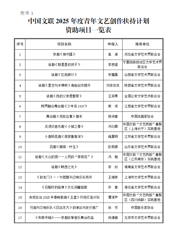 1.中国文联2025年度青年文艺创作扶持计划资助项目一览表