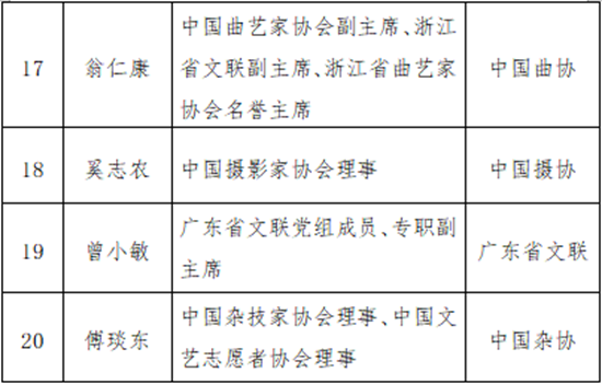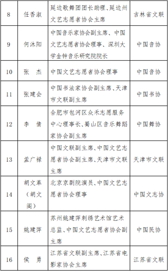 为了积极培育和践行社会主义核心价值观,大力弘扬“奉献、友爱、互助、进步”志愿精神,培育志愿文化,发挥文艺志愿者先进典型示范引领作用,引导全社会向先进典型学精神、学品质、学方法,推动形成崇尚先进、见贤思齐的浓厚氛围,经中央宣传部批准,中国文联首次开展了2025年度“ ‘时代风尚’文艺志愿者”宣传选树活动。经中国文联各团体会员推荐、专家推选、社会公示等环节,推选出2025年度“时代风尚”文艺志愿者20人,现予以公布。